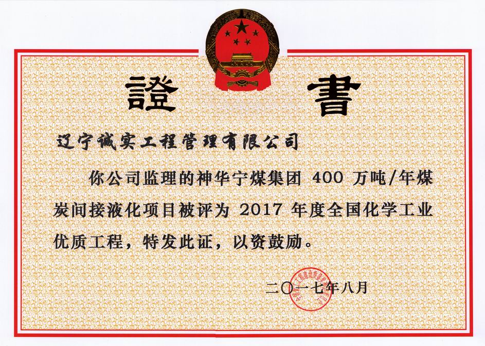 2017年全國(guó)化學(xué)工業(yè)優(yōu)質(zhì)工程(神華寧煤集團(tuán)400萬(wàn)噸/年煤炭間接液化項(xiàng)目)