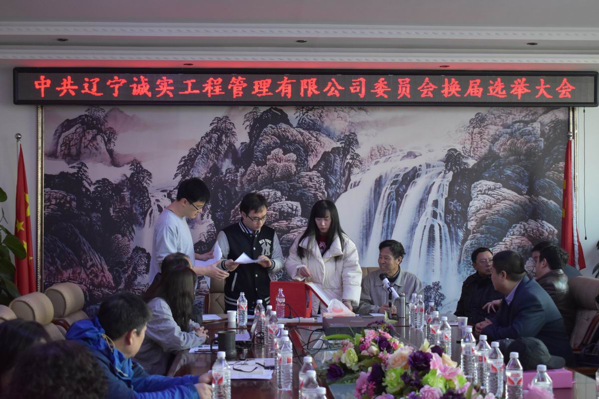 2018年2月7日上午十點,在公司一樓會議室召開了《中共遼寧誠實工程管理有限公司委員會換屆選舉大會》,28名黨員同志參加了此次大會,會議由黨委副書記馮玉琢主持,新?lián)釁^(qū)委組織部任部長及馮疆偉出席了此次會議。