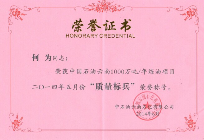表彰:云南項目部何為同志榮獲中國石油云南1000萬噸/年煉油項目2014年5月份“質(zhì)量標(biāo)兵“榮譽(yù)稱號