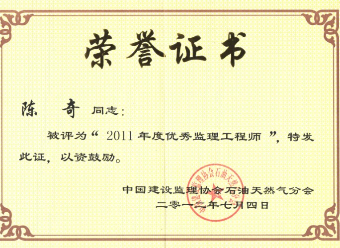陳奇同志被中國建設(shè)監(jiān)理協(xié)會評為年度優(yōu)秀監(jiān)理工程師