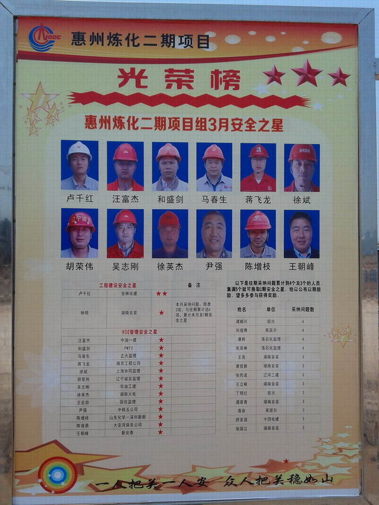 遼寧誠實(shí)工程管理有限公司中海石油惠州煉化項(xiàng)目監(jiān)理部HSE監(jiān)理工程師胡榮偉,喜登業(yè)主中海石油煉化公司惠州煉化分公司設(shè)立的三月安全之星光榮榜,體現(xiàn)了中海石油煉化公司惠州煉化分公司對(duì)我公司監(jiān)理服務(wù)的信任與認(rèn)可。
